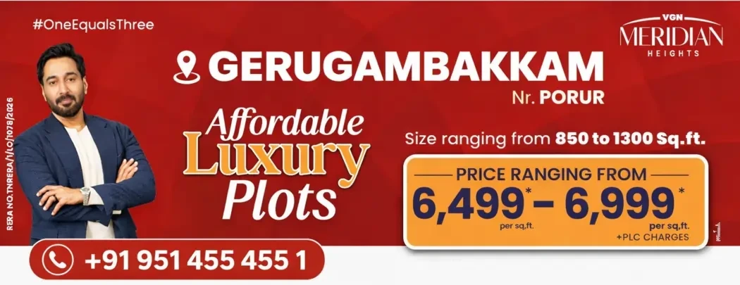 VGN Meridian Heights is a premium plotted community at Gerugambakkam, developed on elevated terrain to promote better airflow, efficient drainage, and a healthier living environment.The project offers 341 residential plots across 13.18 acres, with plot sizes ranging from 750 to 1300 sq.ft. Every plo...
