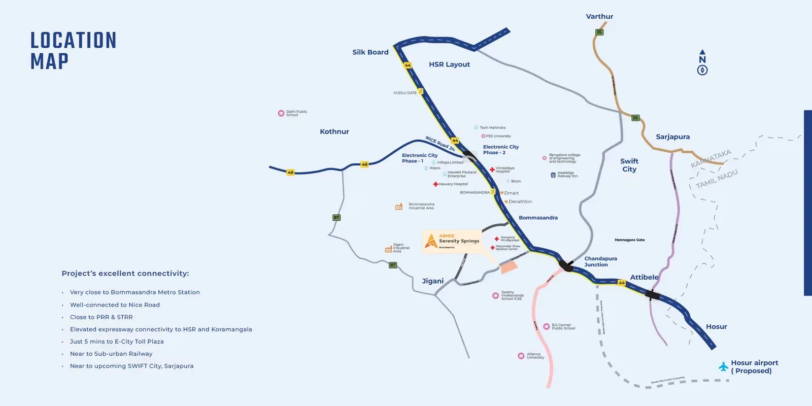 Located in Bommasandra Road, one of Bangalore’s rapidly developing areas, Abhee Serenity Springs ensures excellent connectivity to key IT hubs, educational institutions, healthcare centers, and shopping destinations. With easy access to major roads and public transport, daily commutes become hassle-free.