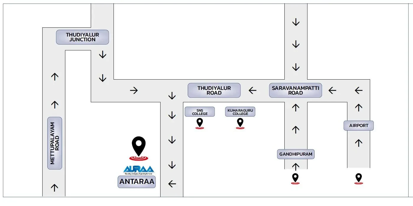 Some popular transit points closest to Antaraa Living Space are Udayampalayam, Thudiyalur railway station and Thudiyalur railway ticket office railway station. Out of this, Udayampalayam is the nearest from this location.