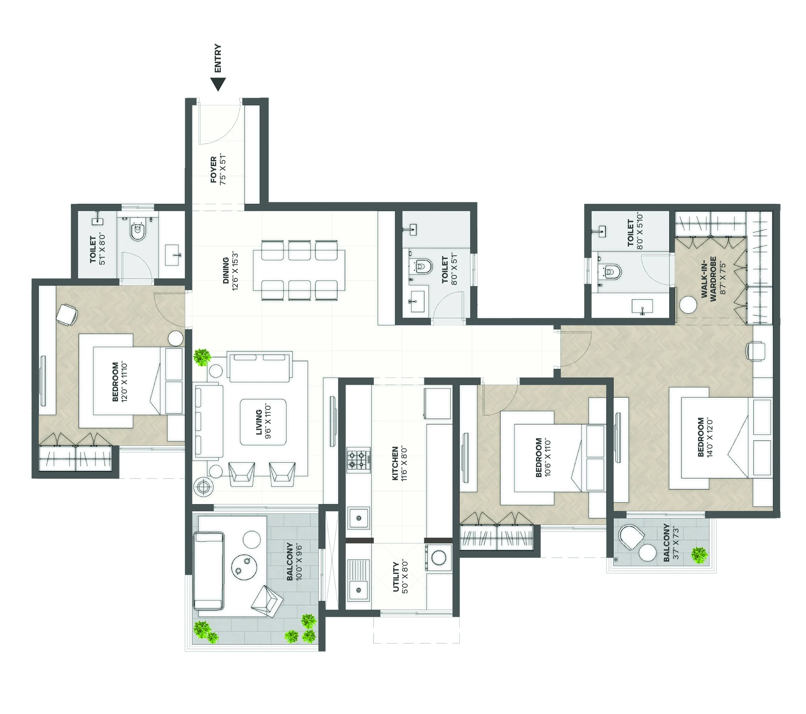 Designed for modern families, every home features expansive balconies (up to 105 sq. ft.), walk-in wardrobes, and layouts that maximize natural light and ventilation. Ranging from 1796 to 1821 sq. ft., these spacious residences redefine everyday living.