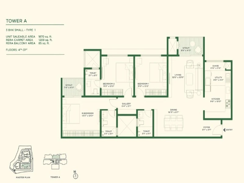 - 3 BHK Apartments: Ranging from 1,870 sq. ft. to 2,070 sq. ft..