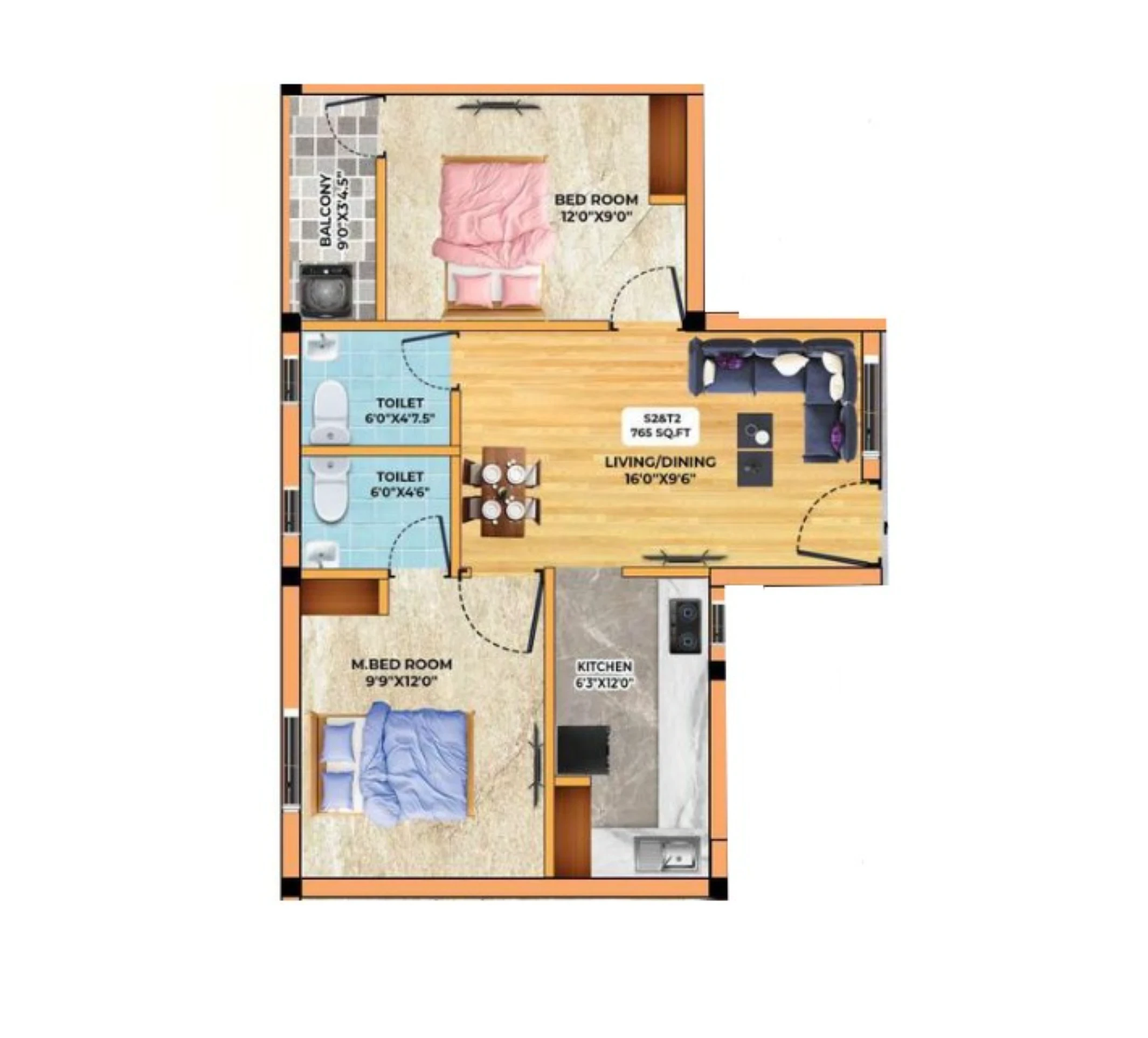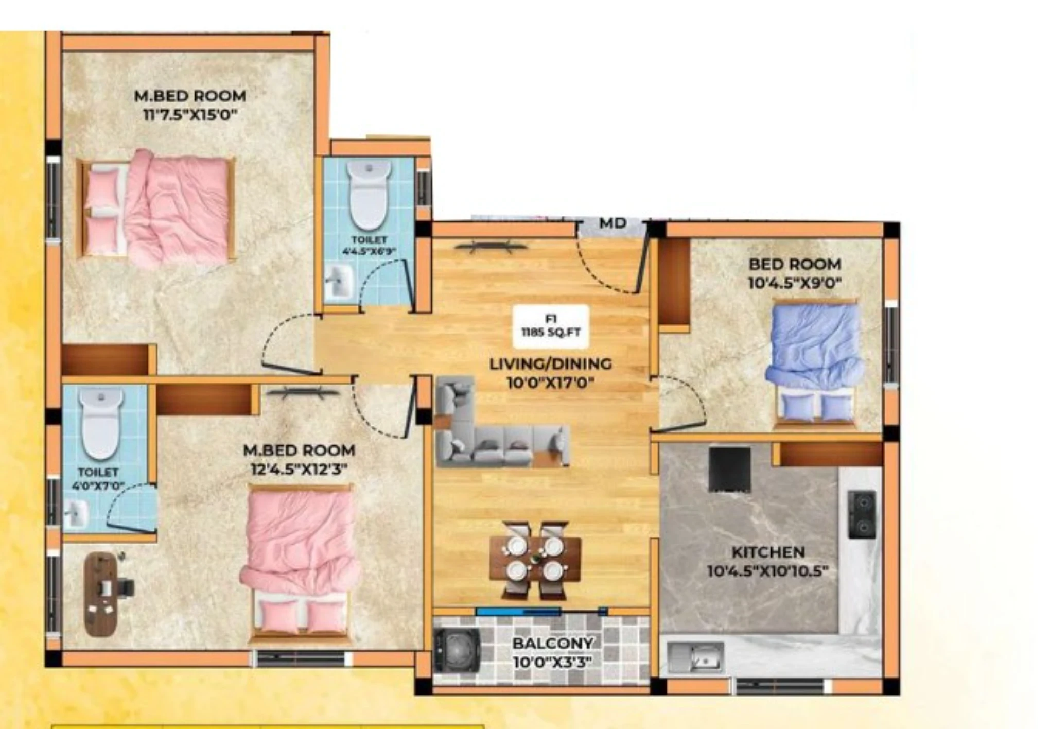 - Living & Dining: High-quality 4' x 2' vitrified tiles (Orient Bell or equivalent brand).