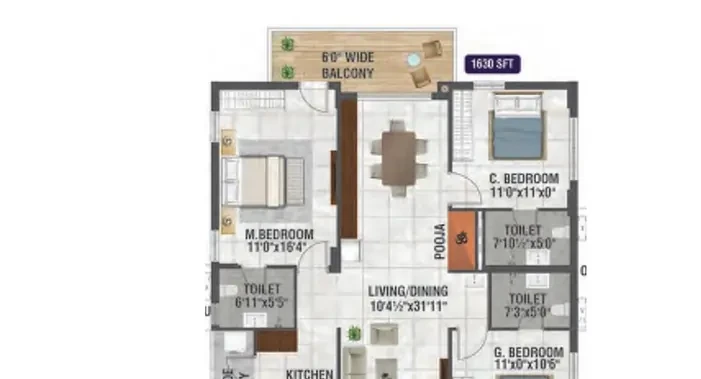 - Pooja, Bedrooms & Kitchen: Double charged vitrified tiles of size 600 x 600mm of reputed make.