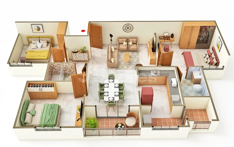 - Main Door: Hardwood Frame with Flush Shutter with both sides Veneer.