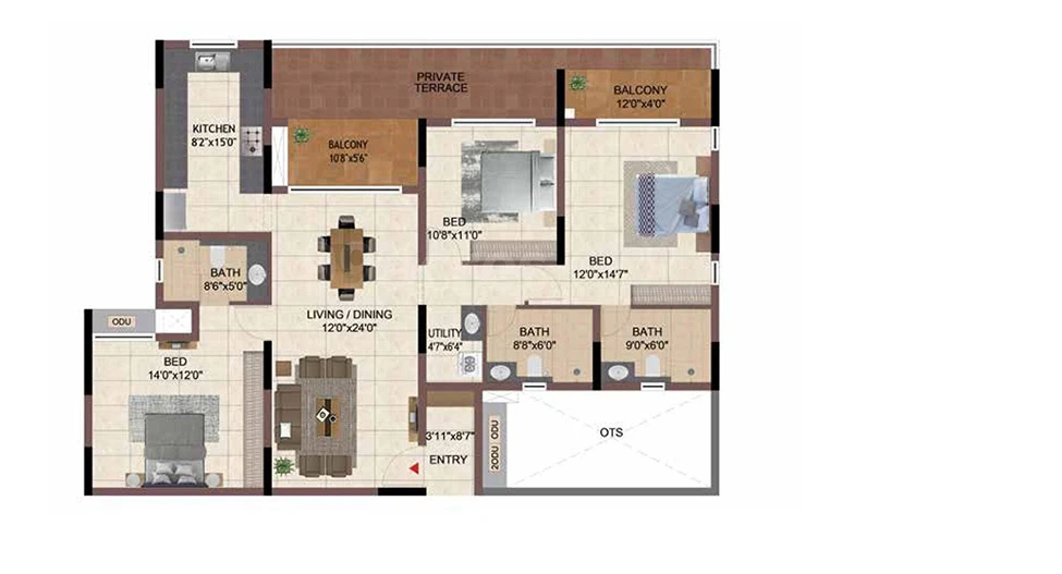 Power Supply: Single Phase connection for 2BHK, Three phase connection for 3BHK.