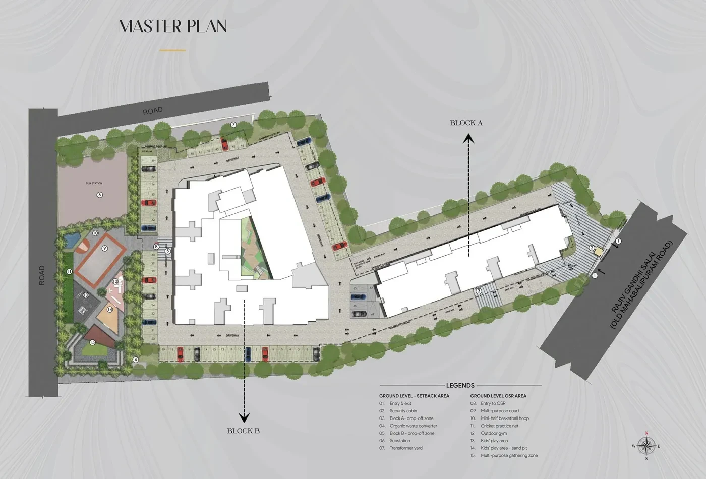 Outdoor: Jogging tracks, outdoor sports courts, amphitheatre, and children's play areas.