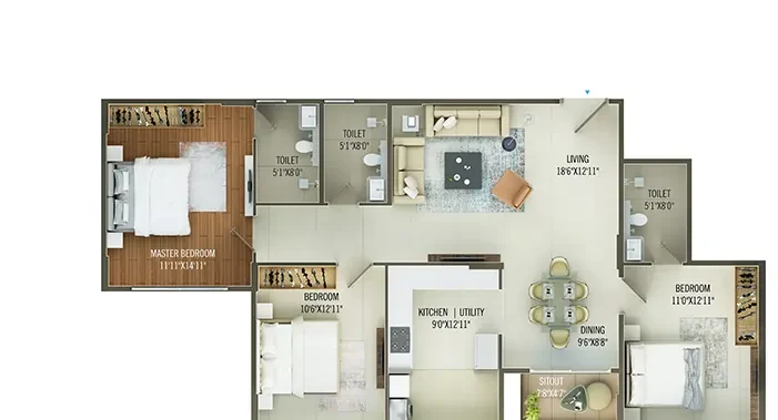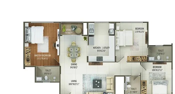 FLOORING 2’ X 4’ Vitrified tiles in living/ dining, bedrooms, and kitchen Wooden laminate flooring in Master Bedroom Ceramic Rustic tiles in balcony, utility, and toilet floors Granite for Corridor Floor BATHROOMS Glazed tile of 600 X 300 for dado up to False ceiling Standard quality plumbing fixtures – Jaguar / Kohler or Equivalent Single Lever Diverter - water supply for all toilets and Hot and cold-water supply for All toilet wash basin Good quality sanitary fixtures of Kohler / Jaguar/ Hindware / equivalent Wall hung EWC in all toilets Vanity counter in bathrooms Glass partition Towel rod KITCHEN Note that granite counter, dado, sink and faucet shall not be provided Kindly use floor mounted faucet in the kitchen DOORS AND WINDOWS 3 track sliding UPVC windows with Mosquito mesh