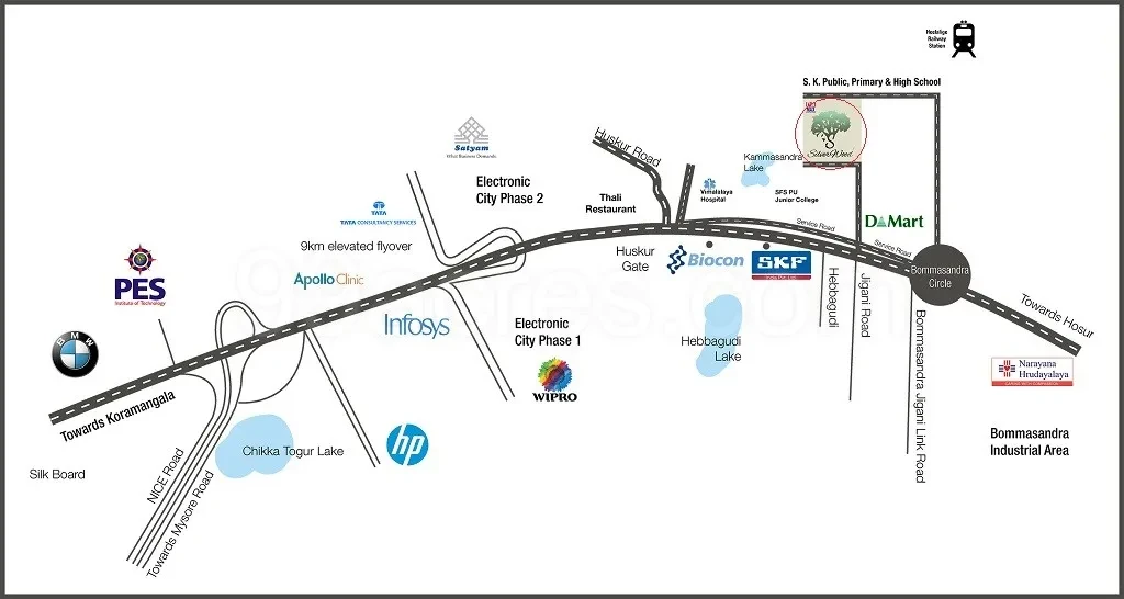 Bommasandra is well-connected to other parts of the city by road, which passes through the heart of this suburb. Prominent shopping malls, movie theatres, schools, and hospitals are present in proximity to this residential project.