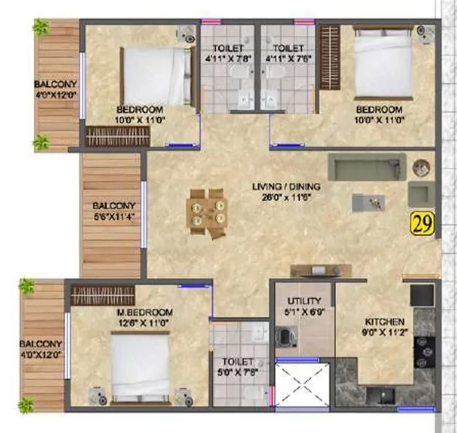 - Balconies & Utility: Anti-Skid Ceramic tiles