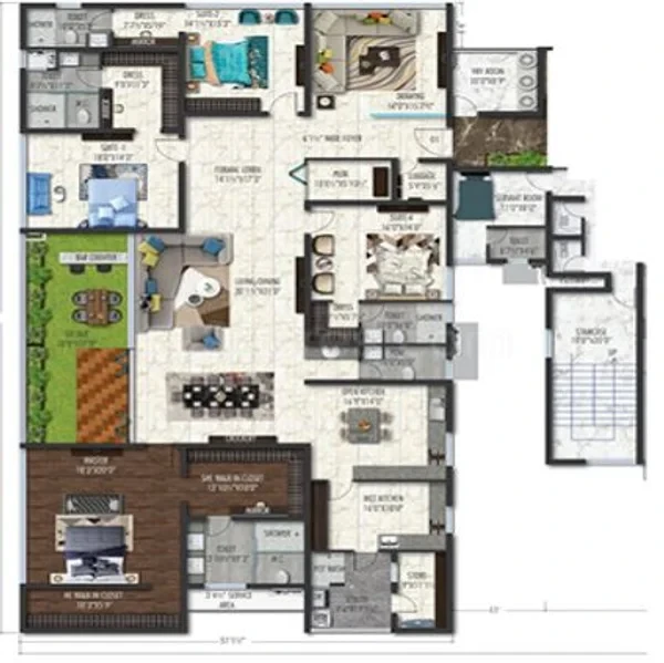 FLOORING * Entrance Lounge: Imported Marble / Large Format Tiles flooring. * Common Lobby: Imported Marble / Large Format Tiles flooring. * Drawing Room, Living, Dining, Pooja Room & Suite Rooms: Large format Vitrified Tiles with skirting. * Master Suite Room: Engineered wooden flooring of reputed make. * Toilets & Powder Room: Concept designer tiles for walls and floor, and dadoing. * Living Balconies / Wet Kitchen: Anti-skid imported quality verified tiles. * Utility: Glazed Ceramic tiles for wash area. * Services Staircase: Granite flooring as per architect design. * Fire Staircase: Tandor Stone flooring. BATHROOMS * Water Closets: Western Style, porcelain EWC of reputed make in all bathrooms. * Health Faucets: Health faucets of reputed make in all bathrooms. * Wash Basins: Porcelain wash basins with vanities of reputed make. * Cockroach Traps: A detachable stainless steel cockroach trap of reputed make in all bathrooms. * Overhead Showers: Overhead showers of reputed make in all bathrooms. * Thermostat diverter with shower of reputed make. * Faucets: All faucets (CP), heavy body metal fittings of reputed make. * Hot water connection to the shower and wash basin in each bathroom. * Rain showers in master bedroom. * Mirrors: LED Glass mirrors in all bathrooms (except in maid room toilet). KITCHEN * Separate tap connection for municipal water and borewell water. * Double Stainless Steel sink in the utility and single bowl sink in the kitchen with single lever spout. * Provision for Dish Washer, Washing Machine with CP Fittings. * Hot water connection to the sink in the kitchen. * Modular Kitchen (Optional feature at extra cost). DOORS AND WINDOWS * Main door frame: Best Teak wood section with seasoning. * Main door shutter: 48mm thick flush door shutter made of solid black board core construction, cross bands and face veneer hot pressed & bonded with phenol formaldehyde synthetic resin adhesive with teak veneer & PU polish on both sides. * Internal door frame: Best Teak wood section with seasoning. * Internal door shutter: 40mm thick flush door shutter made of solid black board core construction, cross bands and face veneer hot pressed & bonded with phenol formaldehyde synthetic resin adhesive with teak veneer & PU polish on both sides. * Bathroom & Maid Room door frame: Best Teak wood section with seasoning. * Bathroom & Maid Room door shutter: 40mm thick flush door shutter made of solid block board core construction, cross bands and face veneer hot pressed and bonded with Phenol formaldehyde synthetic resin adhesive with teak veneer on one side, laminate on other sides. * French Doors: Anodised Aluminium frames with toughened glass panelled sliding shutter with toughened high performance glass and offers advanced thermal to withstand wind loads. * Windows: Imported Aluminium frames, toughened with energy efficient glass sliding / casement with provision for mosquito track and designer hardware of reputed make. * Ventilators: UPVC/Aluminium ventilator for all toilets, store, wet kitchen, servant room & servant toilet. * Hardware: Brush finished stainless steel for all doors. * All doors with a mortise lock or tubular / cylindrical lock. * Magnetic / Concealed door stoppers of reputed make for the main door and the bedroom doors. FINISHES * External Painting: Textured finish with two coats of weather proof exterior emulsion paint of reputed make. * Internal Painting: Smooth putty finish with two coats of premium acrylic emulsion paint of reputed make over a coat of primer. * Sitout & Deck Painting: Weather proof paint of reputed make over external putty finish at utility / sit out walls and ceiling. * Parking area Painting: Texture & Paint. * Entrance Lounge: Aesthetically designed false ceiling. * Common Lobbies: False Ceiling in all lobbies. * False Ceiling with Light fixtures (Optional feature at extra cost). ELECTRICAL * Power plugs for cooking range Chimney, Refrigerator, Microwave Oven, Mixer / Grinder & Aqua Water in kitchen. * Modular Switches of reputed make. * Plug points for T.V. & Audio Systems etc. * Concealed copper wiring of reputed make. * 3 phase Supply for each unit and Energy Meter. * Miniature Circuit Breakers (MCB) for each distribution boards of reputed make. * LED Light Fixtures for all Common Areas & Landscape Area Lighting. * 100% DG set Backup with acoustic enclosure & AMF Panel for all flats and Common area. OTHERS * Balcony Railings: Aesthetically designed toughened glass railing systems with high-quality handrails, cap rails and railing base of reputed make. * Video door phone facility at main door. * Aesthetically designed compound wall shall be constructed all around the plot with solar fencing. STRUCTURE * R.C.C. framed structure to withstand wind and seismic loads. * Super Structure: Block masonry. * Plastering: Double coat cement plastering with smooth finish. ELEVATORS * Residents / Guests Lifts: High speed automatic Stainless Steel Lifts of Mitsubishi/Toshiba or equivalent make with group control and ARD with V3F for energy efficiency. * Lift flooring: Aesthetically designed flooring of imported marble / granite. * Lift cladding: Imported Marble / Granite. * Service / Goods Lifts: One high speed automatic Stainless Steel Lifts of reputed make with ARD with V3F for energy efficiency. * Panic button and intercom provided in the lift and is connected to security room. HOME AUTOMATION * Gas leak detector with shut-off valve. * Provision to install Wi-Fi within house. * Meter readings with bill alerts. TELECOMMUNICATION AND INTERNET * Telephone points in Living, Dining Areas, all Bedrooms. * Intercom facility to all the units connecting Security. * DTH Provision for Cable Connection in Living and all Bedrooms. * Wired internet provision in master bedroom, children bedroom and drawing room. WATER AND SEWAGE TREATMENT * Fully treated water made available through exclusive water softening plant of bore well water. * A Sewage Treatment plant of adequate capaci