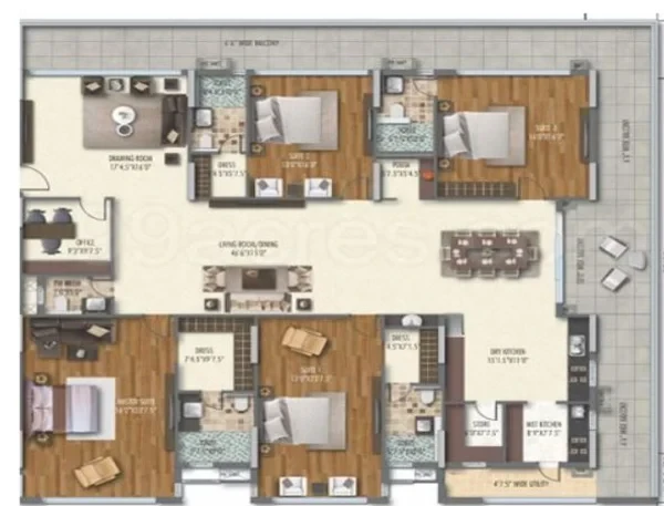 Foyer, office, drawing, living, dinning, puja, dry kitchen: