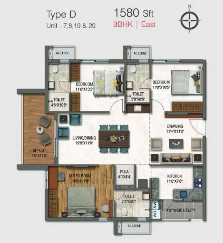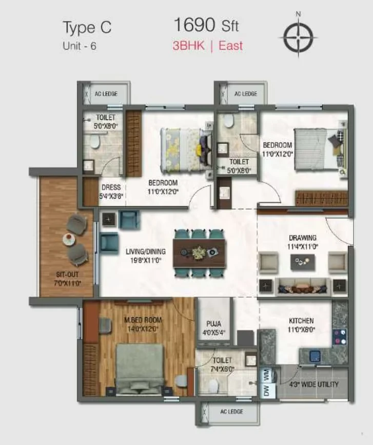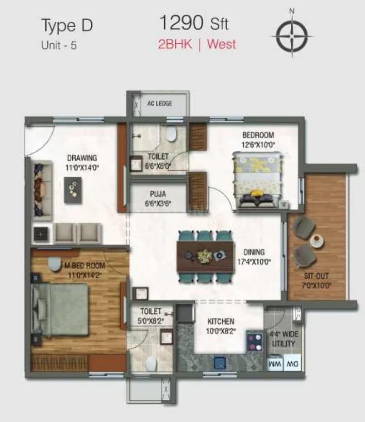 • Provision for Washing machine and S.S single bowl sink with Granite counter in utility.