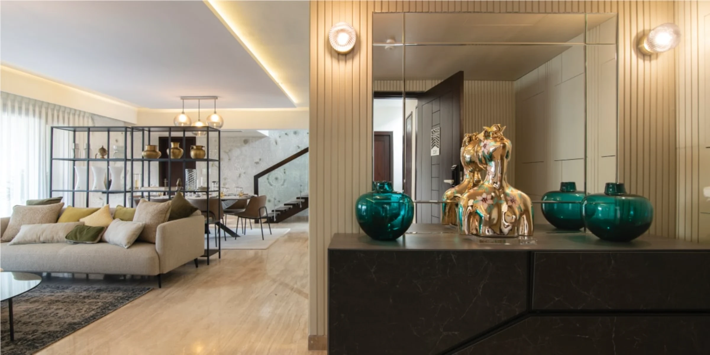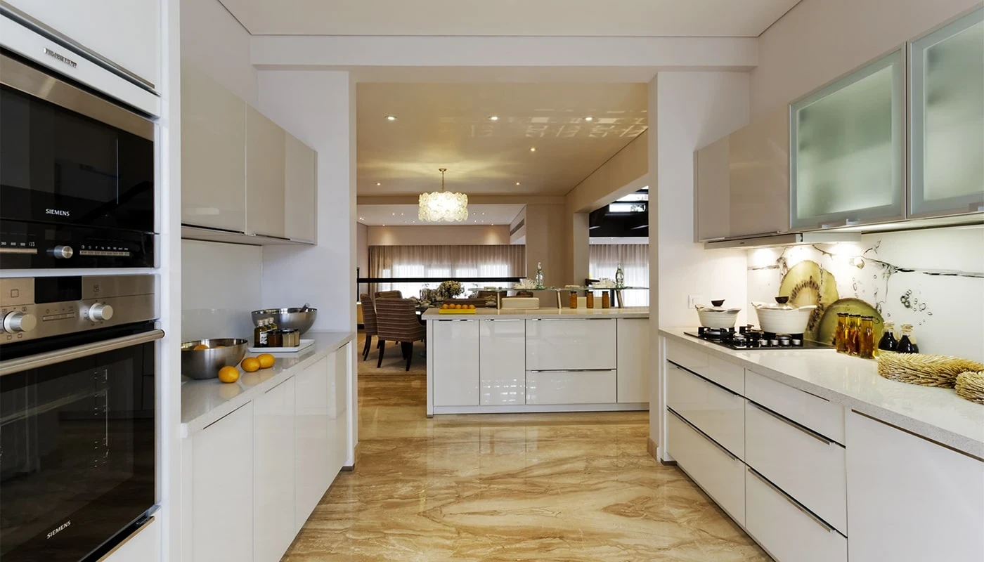 Interior & Construction DetailsCategory Specification DetailsStructureRCC framed structure with concrete solid block masonry.FlooringItalian marble in the foyer, living, dining, and corridors; laminated wooden flooring in bedrooms; and external-grade wooden flooring for balconies.KitchenFully fitted Nolte kitchens including hob, hood, dishwasher, refrigerator, microwave, and oven. Features engineered quartz countertops.BathroomsWall-hung EWCs by Duravit/Kohler; chrome-plated fittings by Grohe; master bathrooms include a free-standing bathtub and shower enclosure.Doors/Windows7.5-foot high teak wood main doors; internal doors with wood veneer and PU lacquer finish; external windows use UPVC frames with sliding shutters.HVACCentrally air-conditioned units using a VRF system with zoning controls.Electrical18 KVA power load per home with 100% backup for all units and common areas.Home Automation & Security
