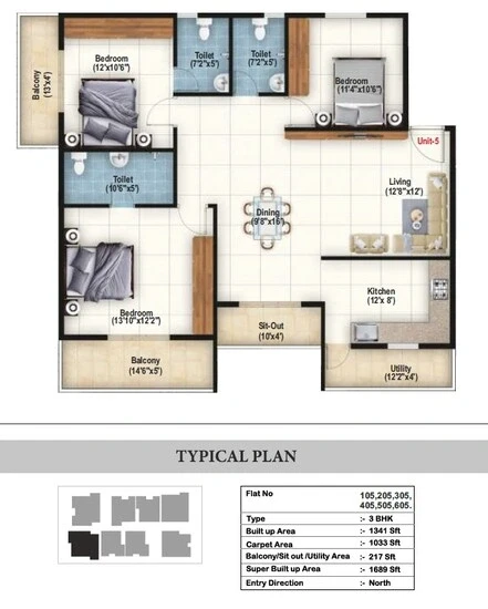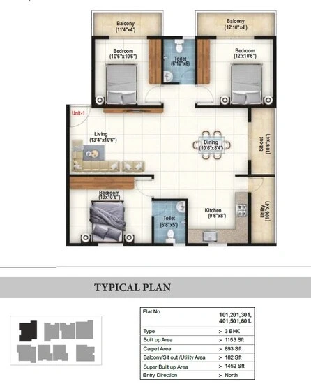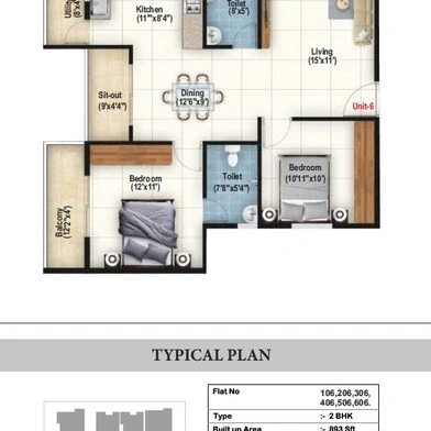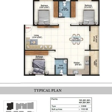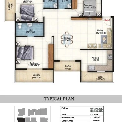 Flooring: Vitrified tiles for living, dining, and all bedrooms; anti-skid vitrified tiles for balconies and toilets.
