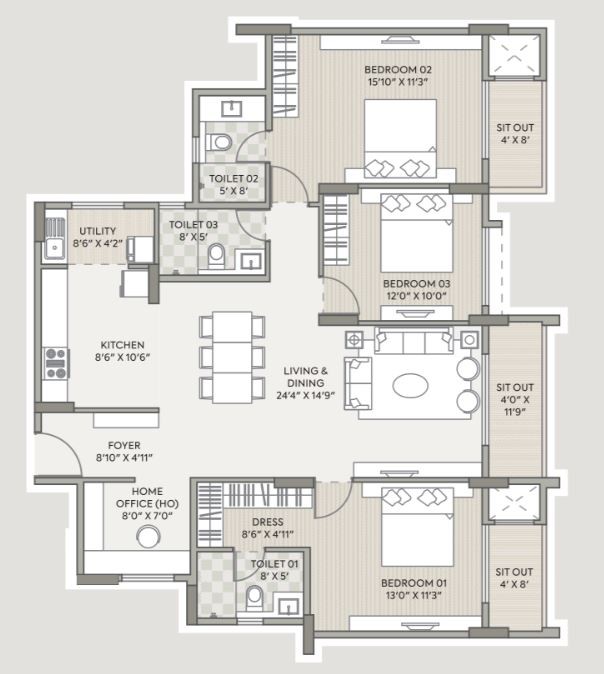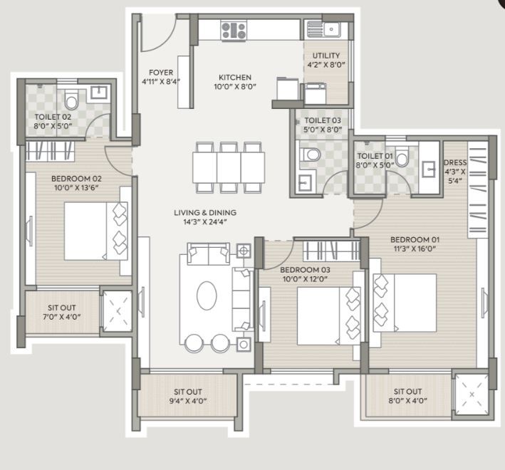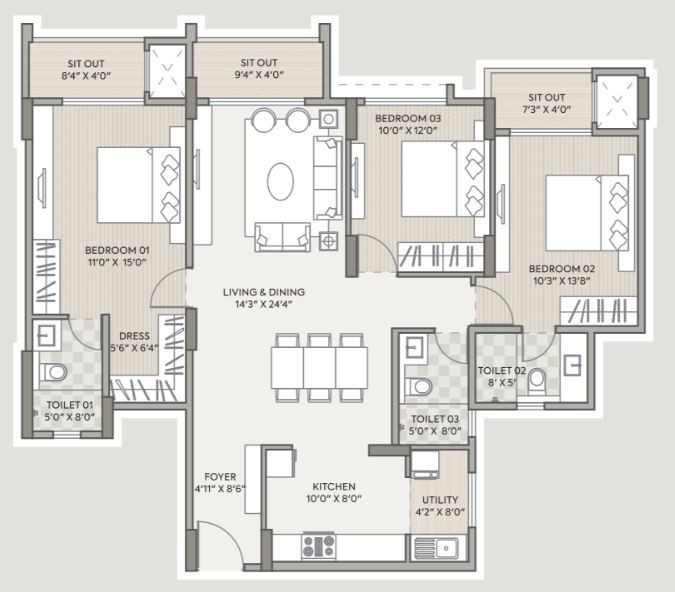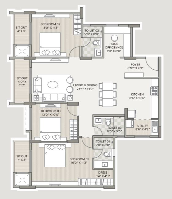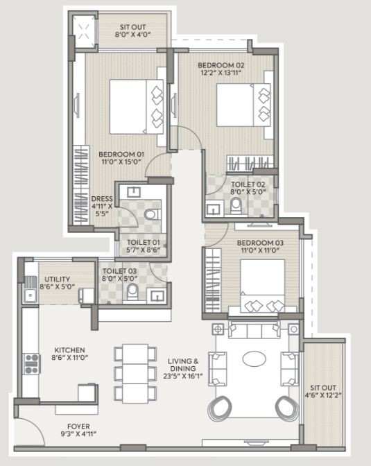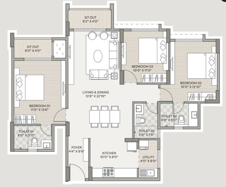 Vitrified tiles of 800X800mm for living/dining/kitchen/bedrooms & utility area.
