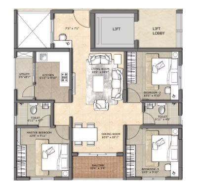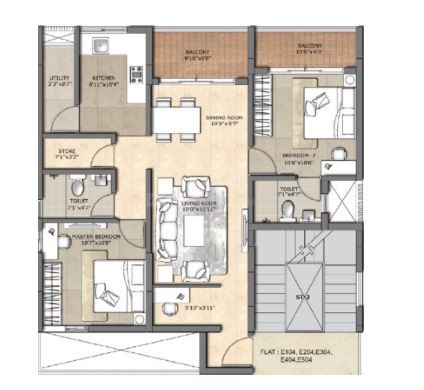 Vitrified tiles of Johnson/Aguvarmora or equivalent brand in living/dining/bed/kitchen. Anti-skid tiles of Johnson/Aguvarmora or equivalent brand for balcony. Tiles as per architect's design in lobbies & corridors.