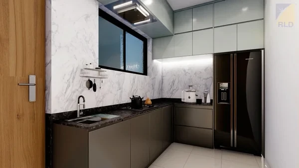 Granite platform with SS sink. Ceramic tile dado. Provision for RO water purifier.