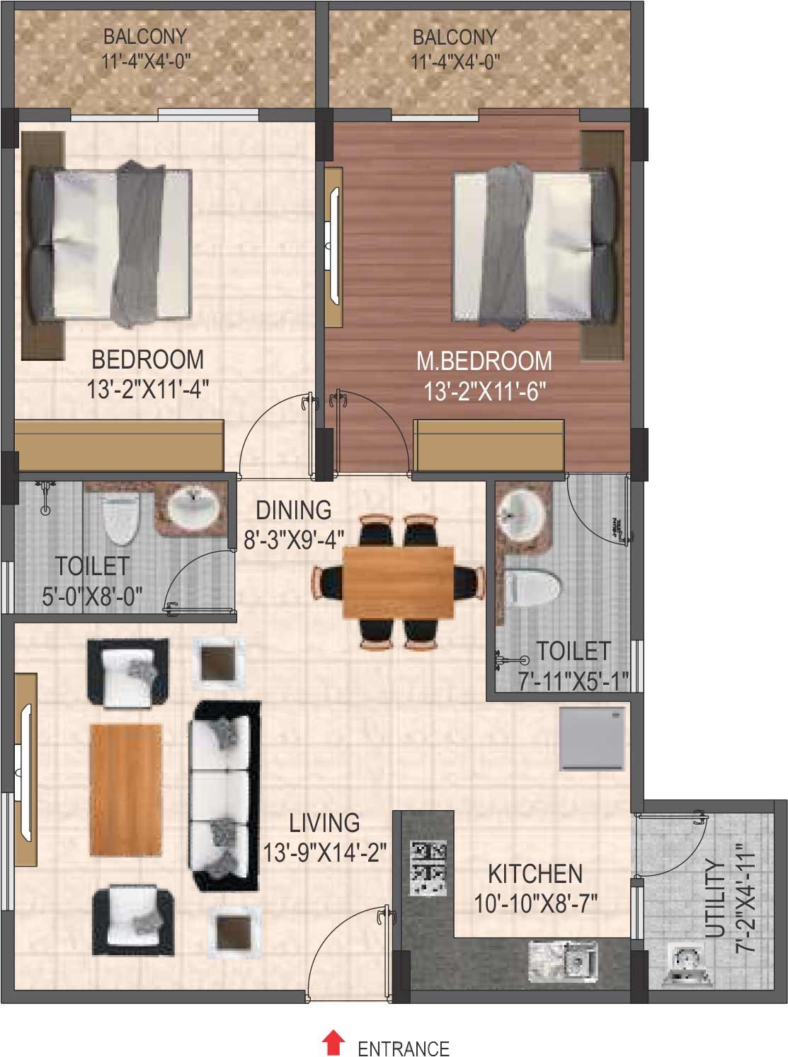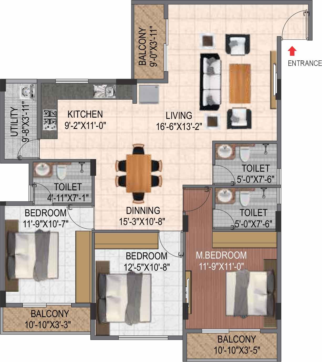 Flat: Premium Vitrified flooring in all rooms and living areaMaster Bed room: Wooden flooringBalcony: Anti Skid Ceramic flooringCommon Area: Premium Vitrified flooring TOILETS