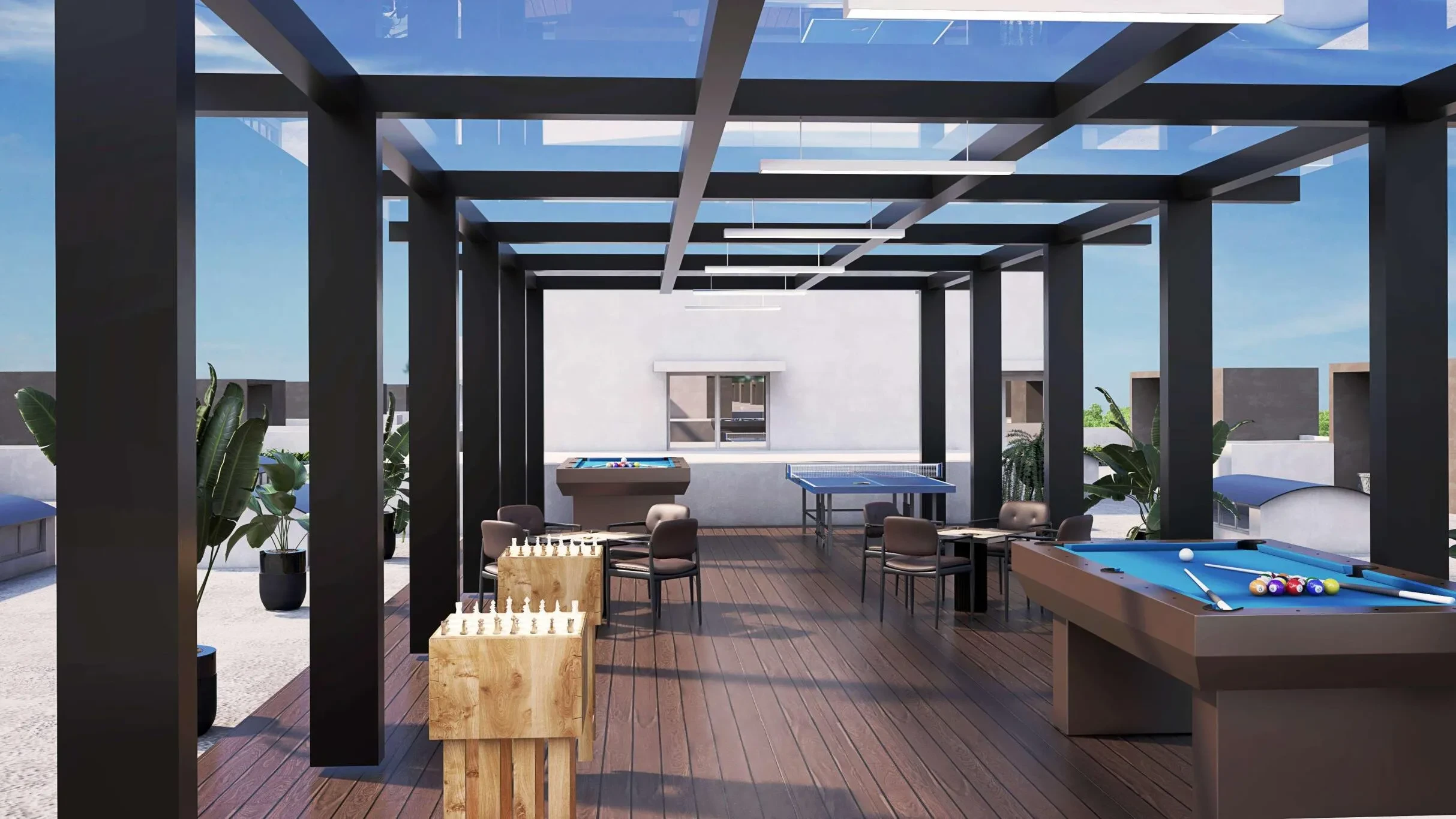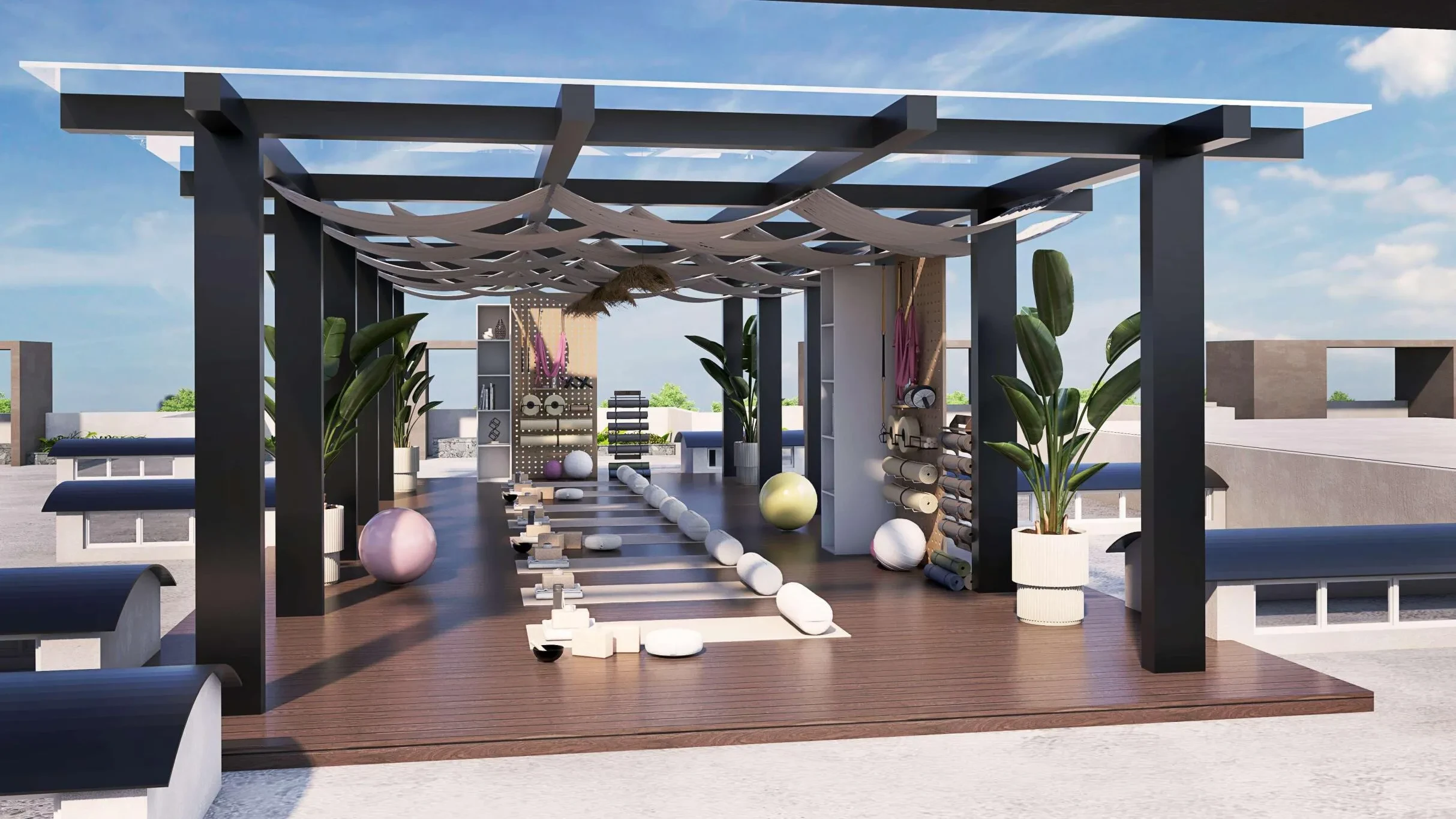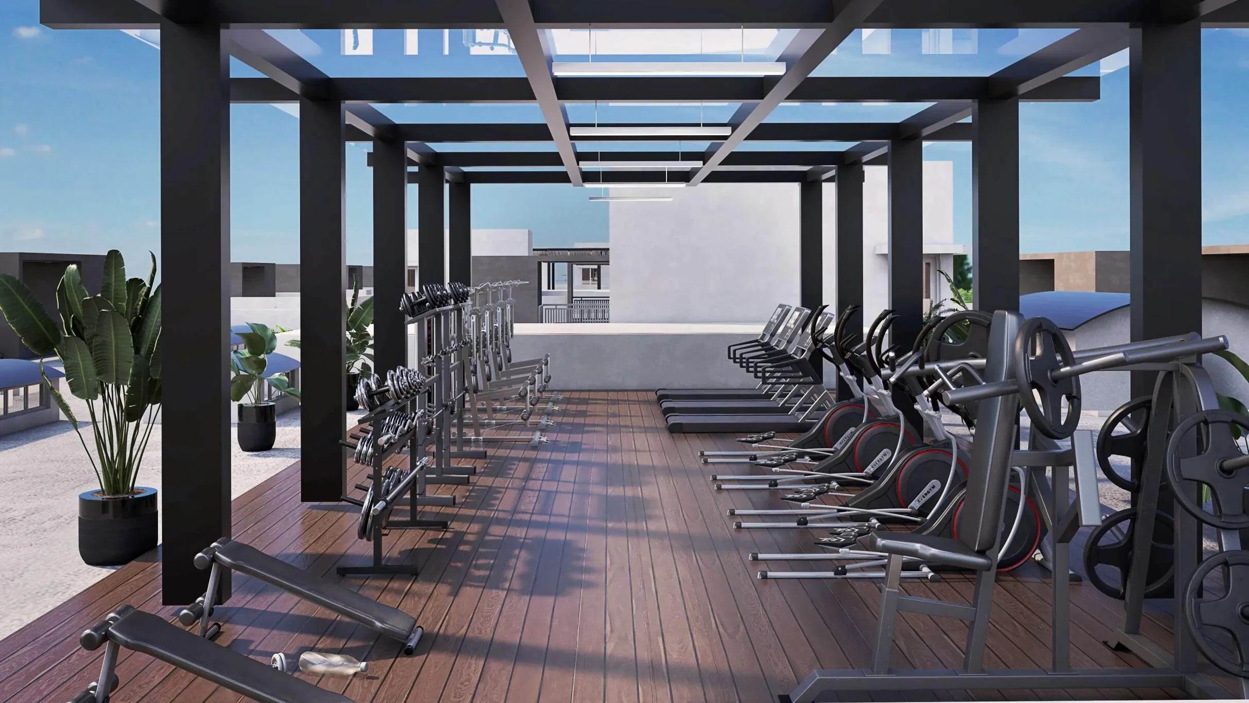 Recreational: Terrace gymnasium, BBQ nook, children's play area, walking track, and sky movie setup.
