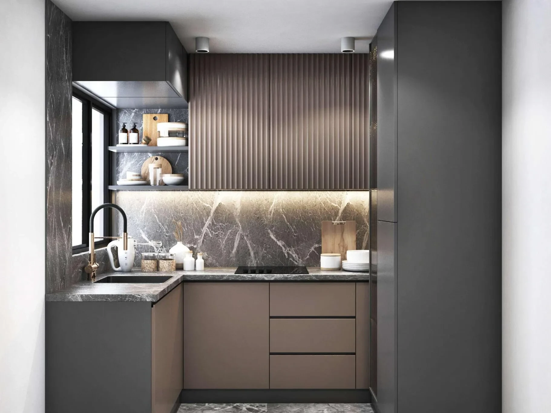 Designer Dado tiles up to 2 ft height above the kitchen counter. Provision for Chimney & HOB (Electrical Only). Granite platform with high quality SS sink