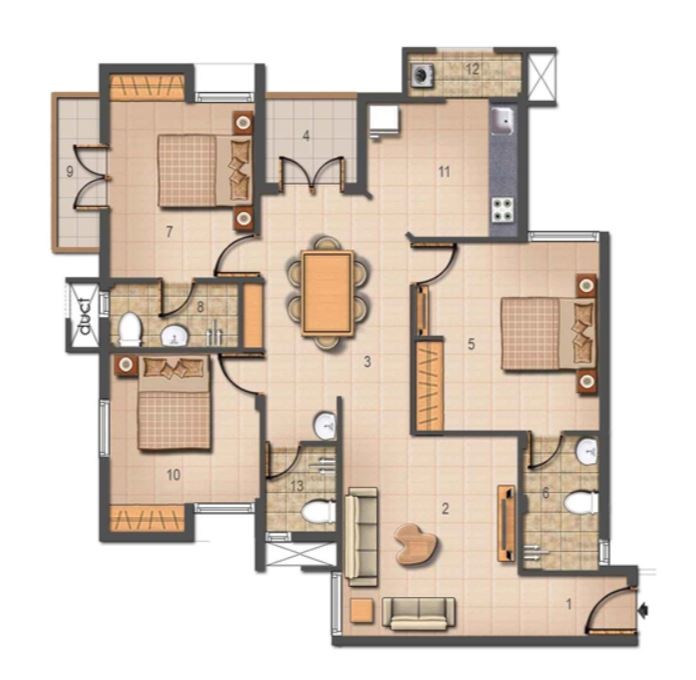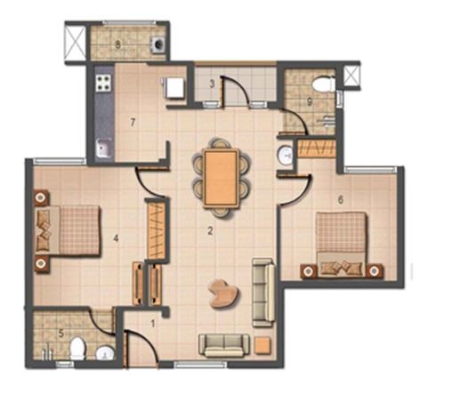 The flooring in living, dining, bedrooms and kitchen will be of Vitrified tiles.