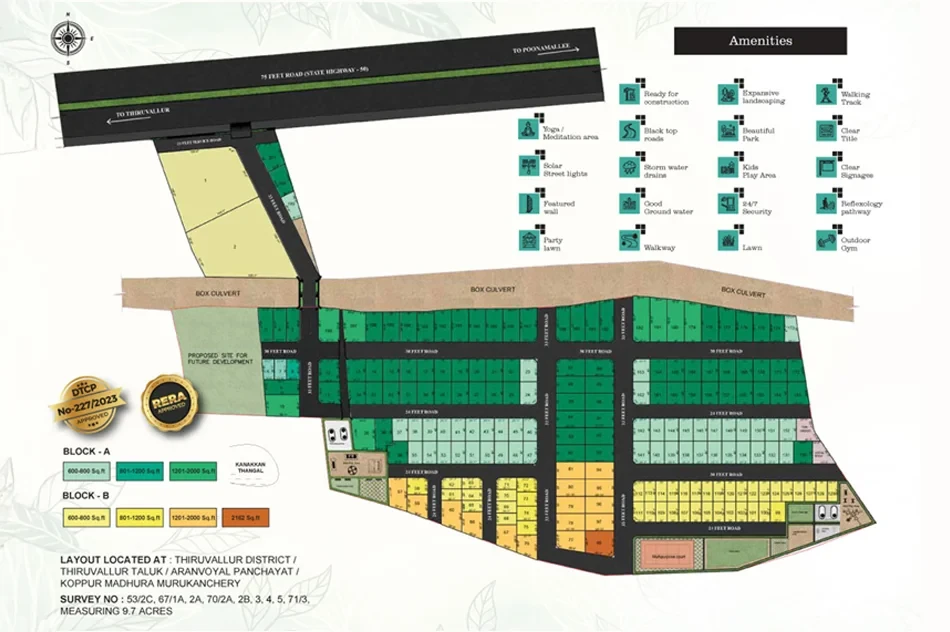 Discover a truly enriching life at Aura Residences, the most elegant address near Thirumazhisai. This DTCP-approved, luxury gated community spans 9.7 acres of lush greenery with 201 premium villa plots ranging from 600 to 3000 sq.ft. Nestled away from the city’s hustle, it offers a perfect blend of nature and connectivity, just minutes from key landmarks.