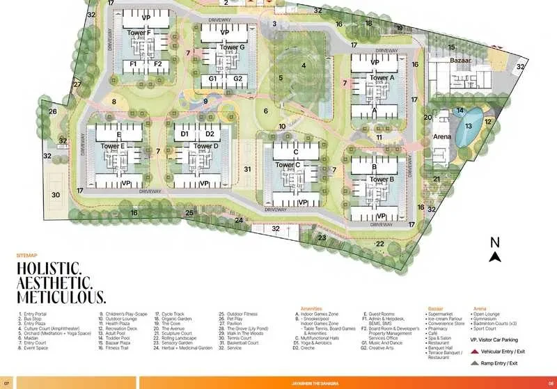 Health & Wellness: Includes a 40,000 sq. ft. sports arena, gymnasium, swimming pool (with toddler pool), yoga/meditation orchard, and a "sensory garden".