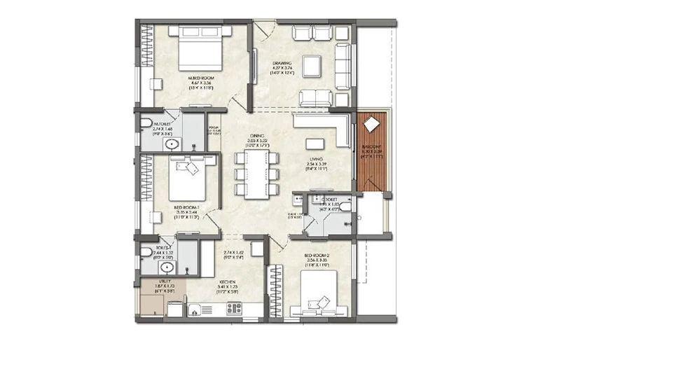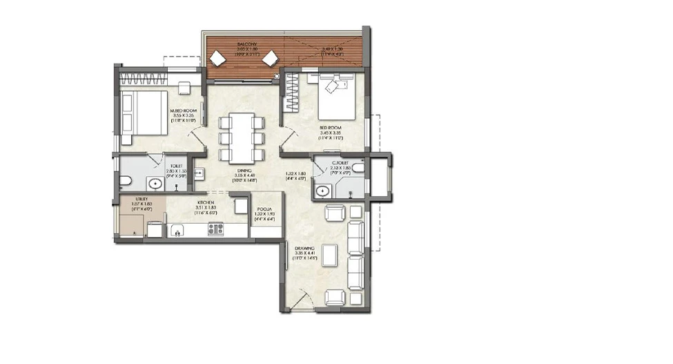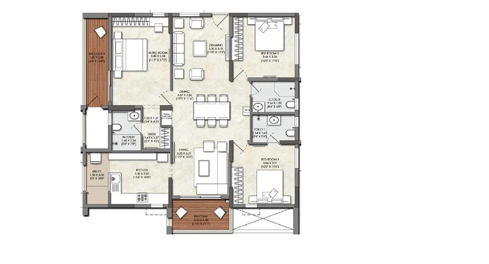 Bathrooms: Equipped with premium sanitary ware and CP (Chrome Plated) fittings from reputed brands. They also include water-efficient plumbing fixtures and provisions for exhaust fans.