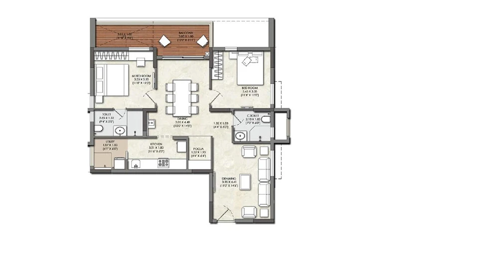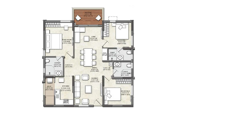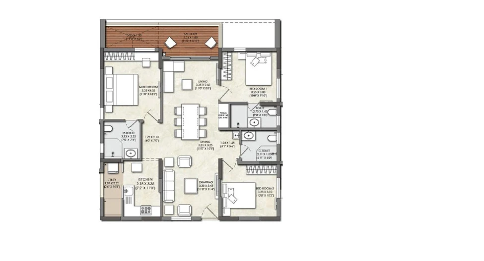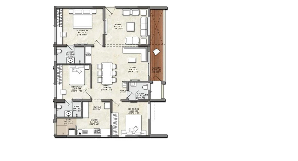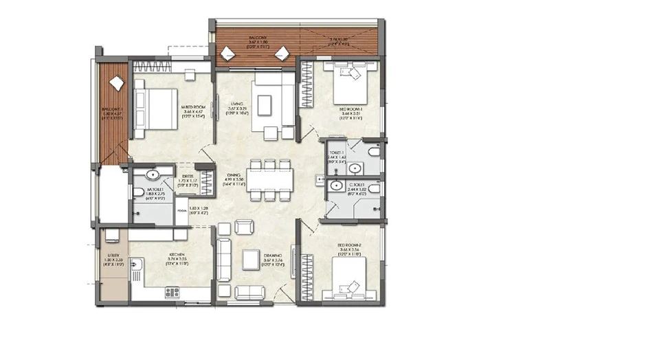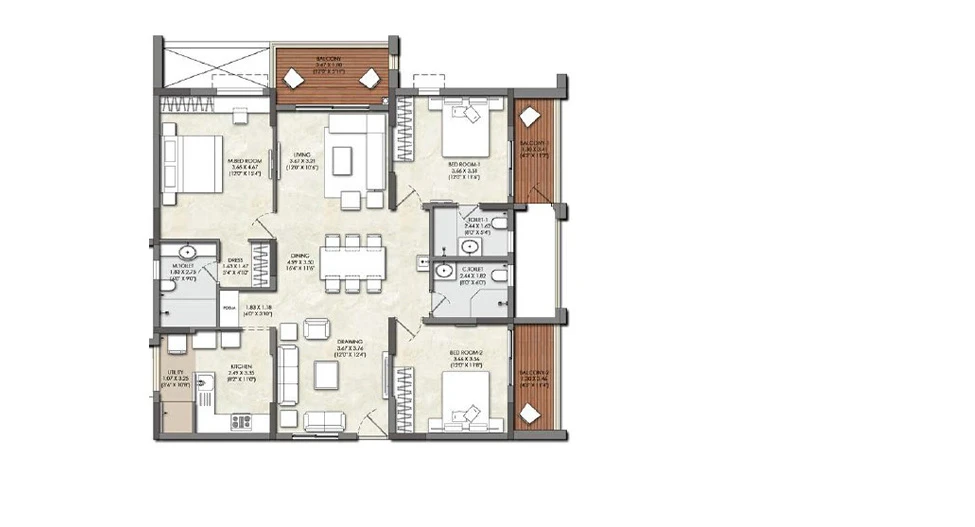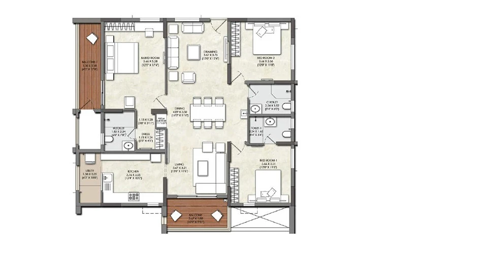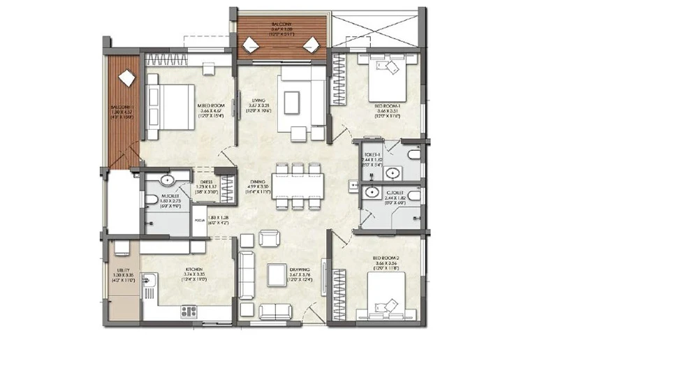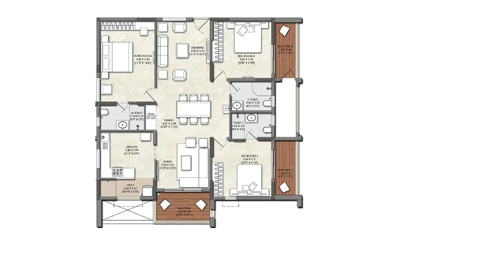 Balconies: Finished with acid-resistant and anti-skid ceramic tiles for safety and durability.