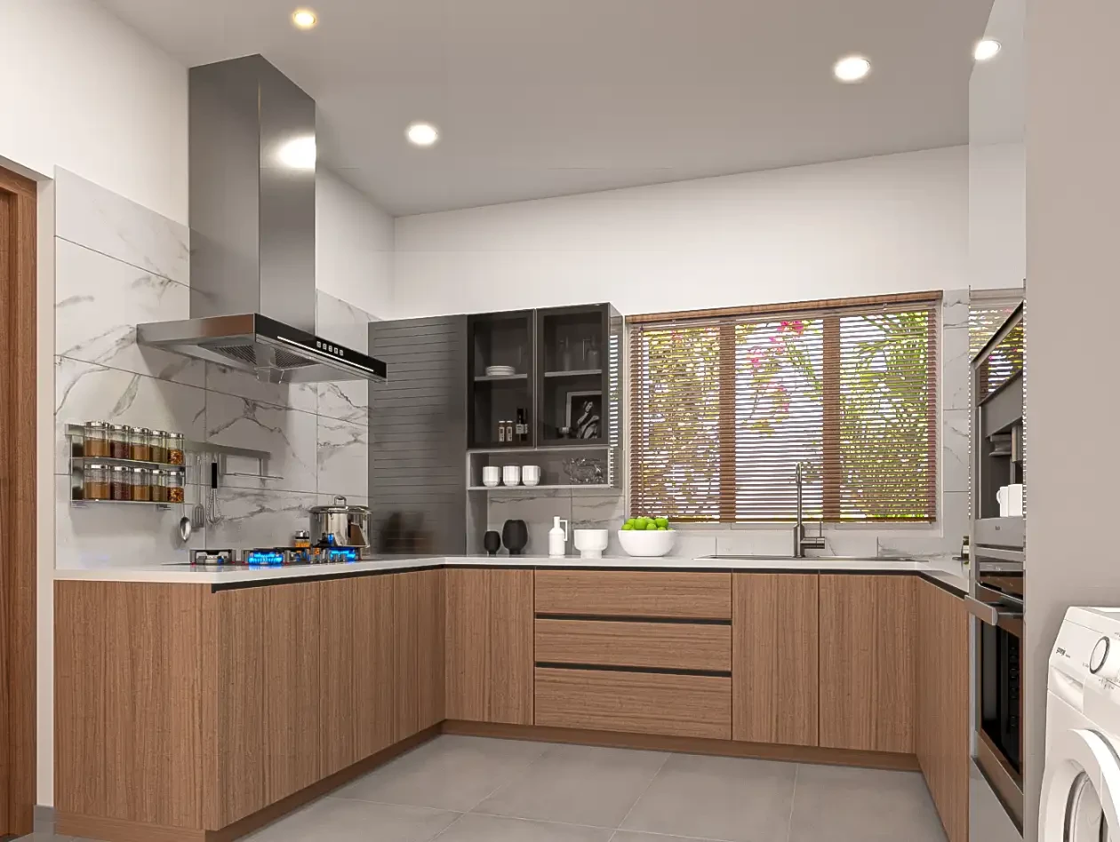 Wide main door of size 4ft x 8ft. Teak wood Frame and Door with Architrave and a side panel. Ironmongeries like digital lock from Yale or equivalent brand, tower bolts, door viewer, safety latch & magnetic catcher.