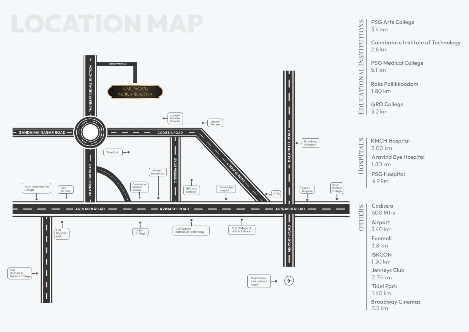 - Prime Road Connectivity – Well-connected through Avinashi Road, Codissia Road, and Kalapatti Road, ensuring smooth commutes across Coimbatore.
