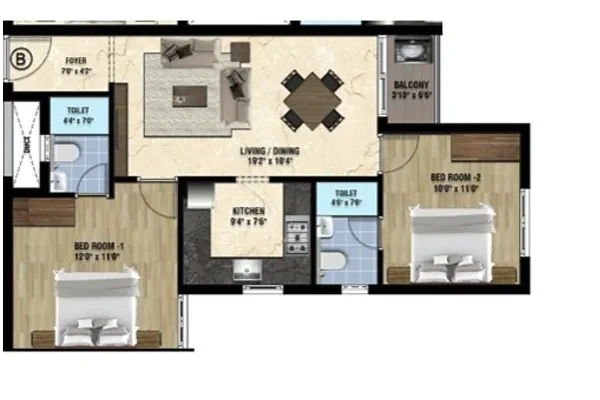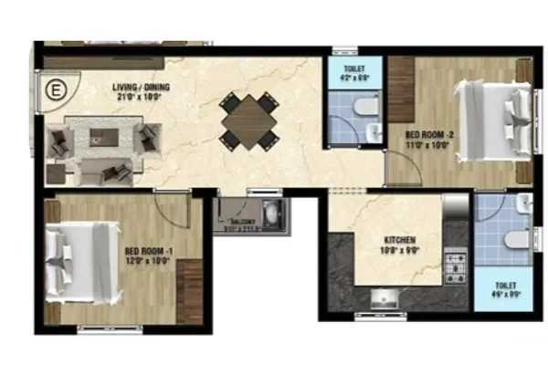 Sizes :Sizes :(2 BHK) 828 sq ft To 833 sq ft.,