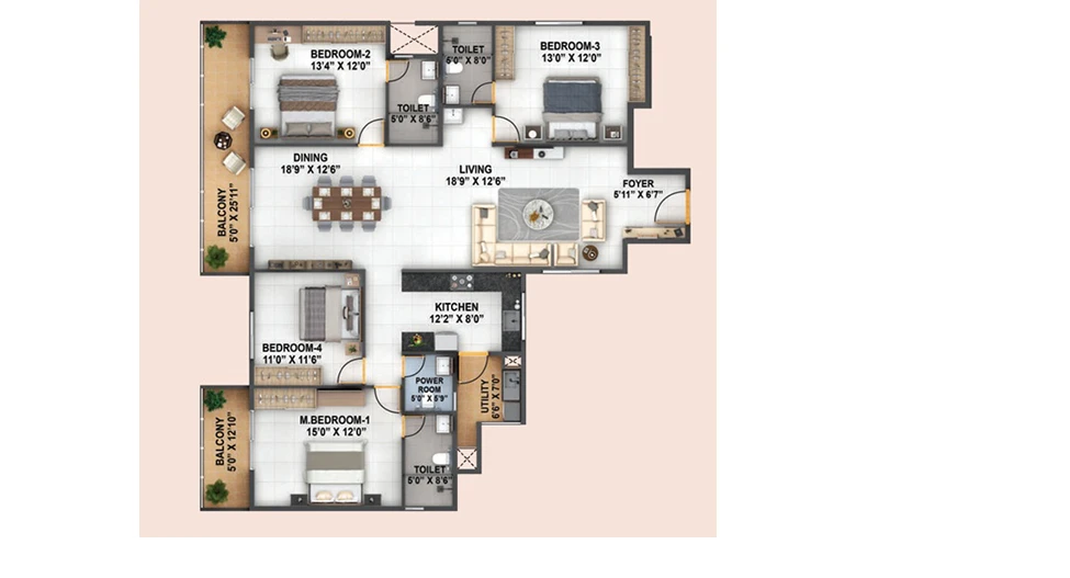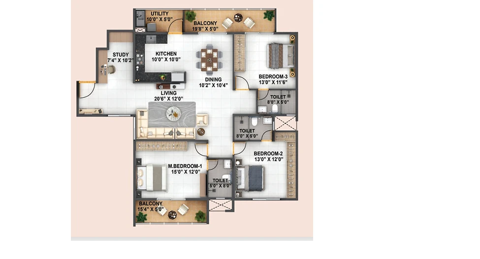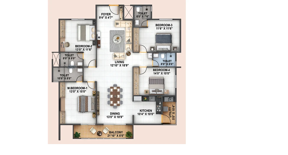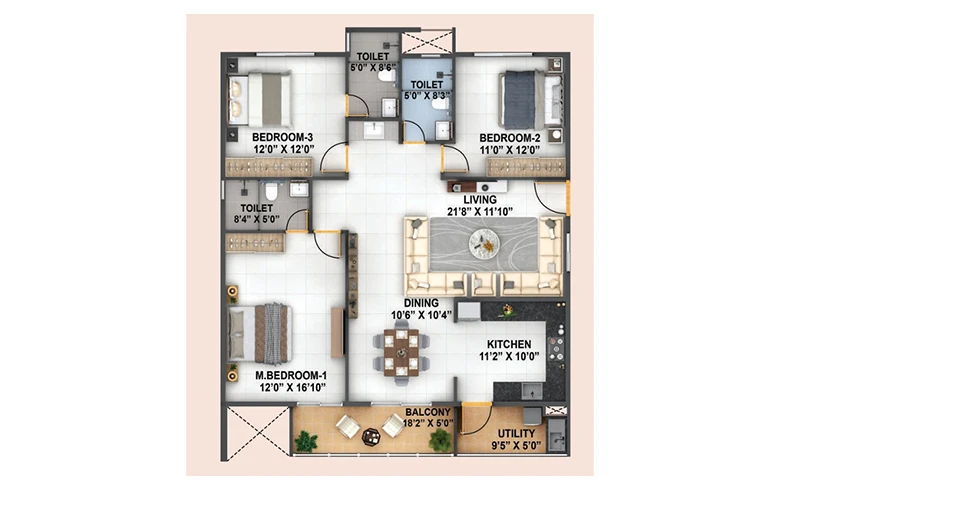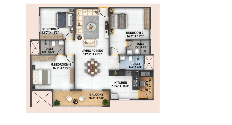 8. First-quality vitrified tiles shall be provided for flooring in living, dining, bedrooms, kitchen, and ceramic tiles in balconies and utilities.