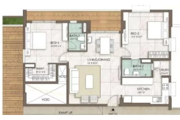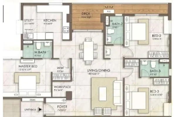 Living, Dining, Bedroom & Kitchen will be finished with 4’*2’ vitrified tiles