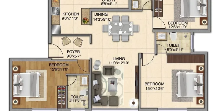 Foyer, Living & Dining: Premium Vitrified TilesKitchen: Premium Vitrified TilesMaster Bedroom: Laminated Wooden FlooringMaster Bedroom Toilet: Anti- Skid Ceramic TilesOther Bedrooms: Premium Vitrified TilesOther Toilet: Anti- Skid Ceramic TilesBalcony: Rustic Ceramic TilesUtility: Rustic Ceramic TilesLobby Area: Designer Vitrified Tiles