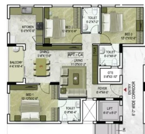 Kitchen and Bedroom areas finished with high-quality 4x2 vitrified tiles of the builder’s choice, including necessary skirting.