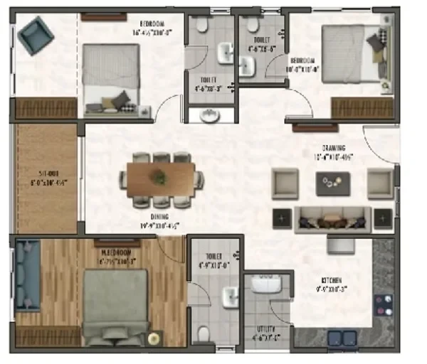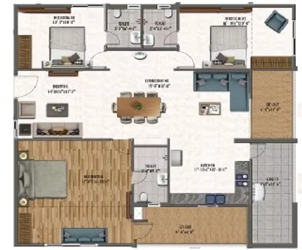 Balconies: Anti-skid ceramic tiles/Wooden finish ceramic tiles of reputed make.