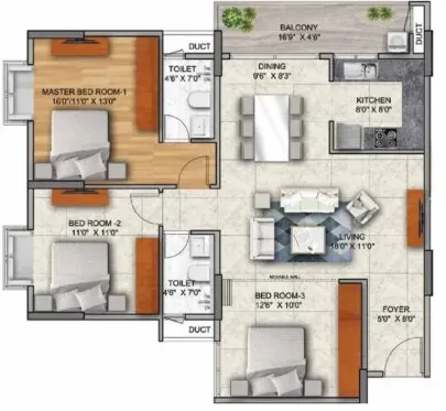 Flooring: Vitrified tiles in living, dining, kitchen, and bedrooms; laminated wooden flooring in the master bedroom.