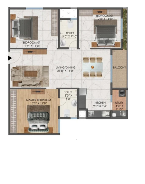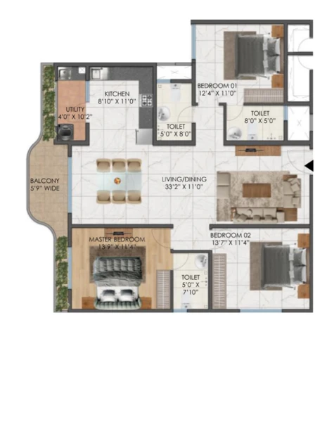 • Standard make vitrified tiles in all bedrooms, living room, dining,and kitchen.