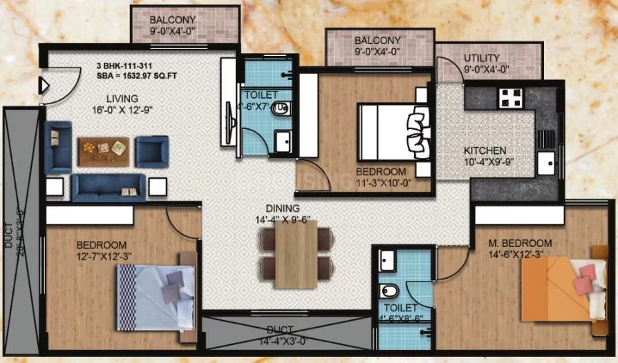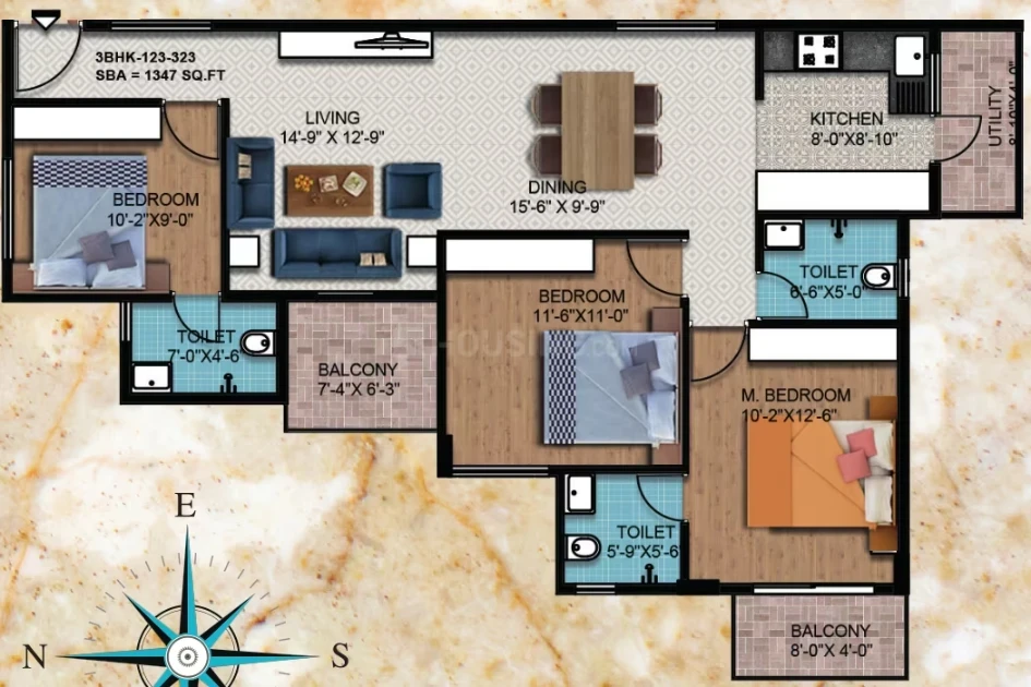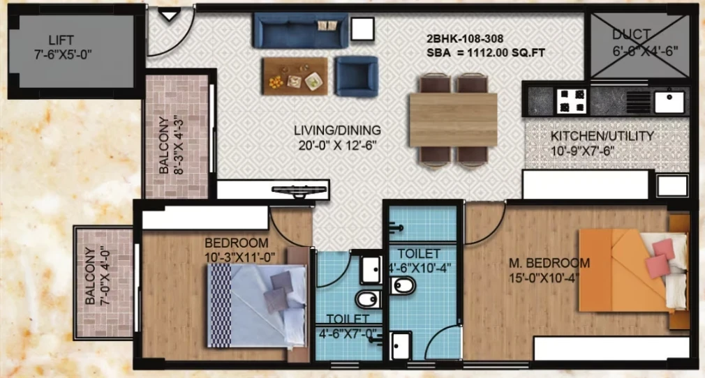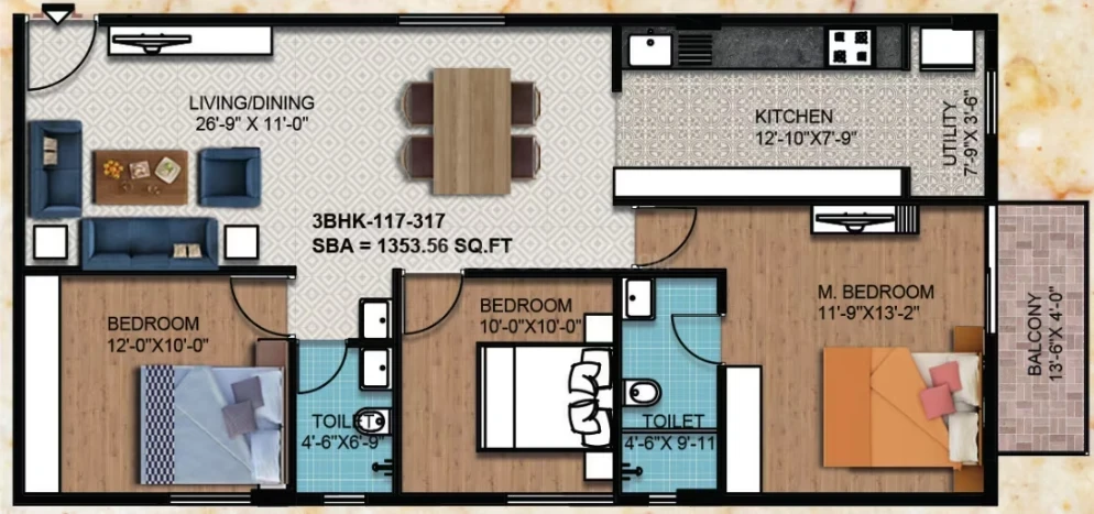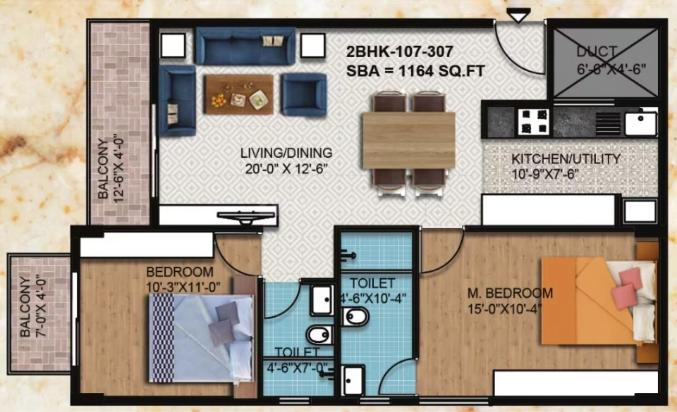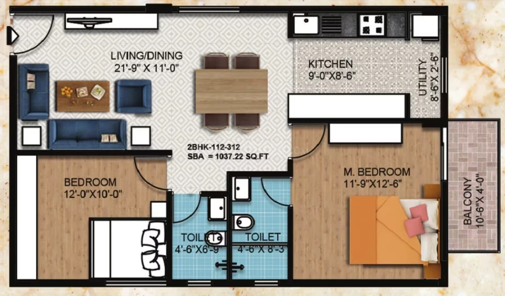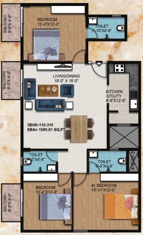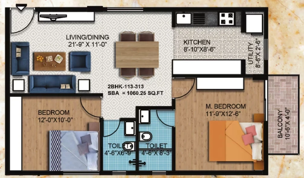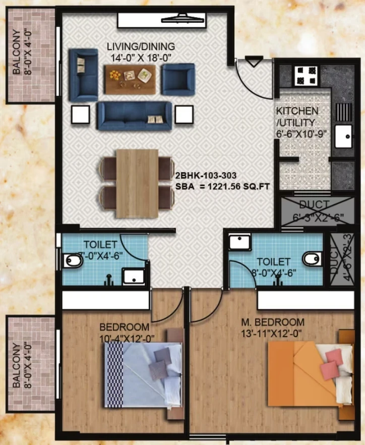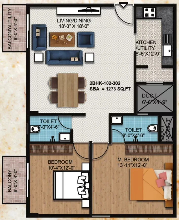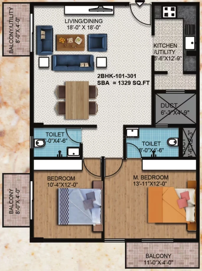 Flooring: 2'x2' vitrified tiles in living/dining/kitchen; laminated wooden flooring in the master bedroom; anti-skid ceramic tiles for toilets and balconies.