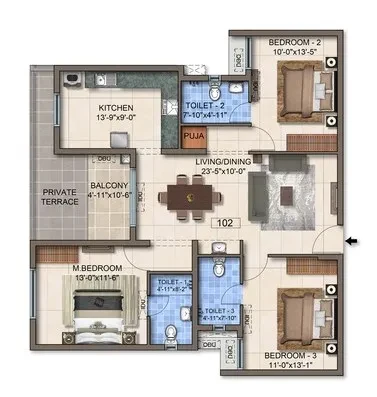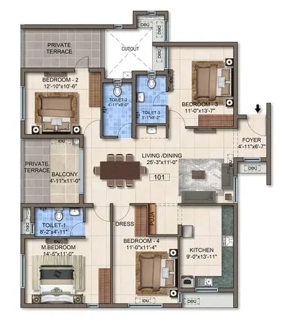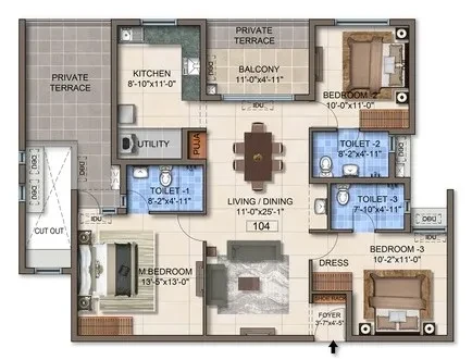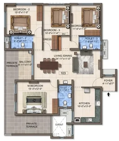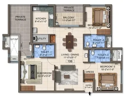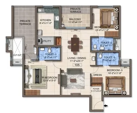 Wood pattern tiles in Master bedroom & Kitchen. Vitrified tiles for Living, dining and the other bedrooms. Anti-skid tiles for Balcony, Utility & Toilets