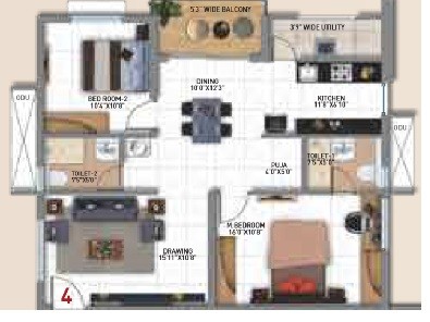 Balcony/Bathroom/Utility : Anti-skid vitrified/ceramic tiles.