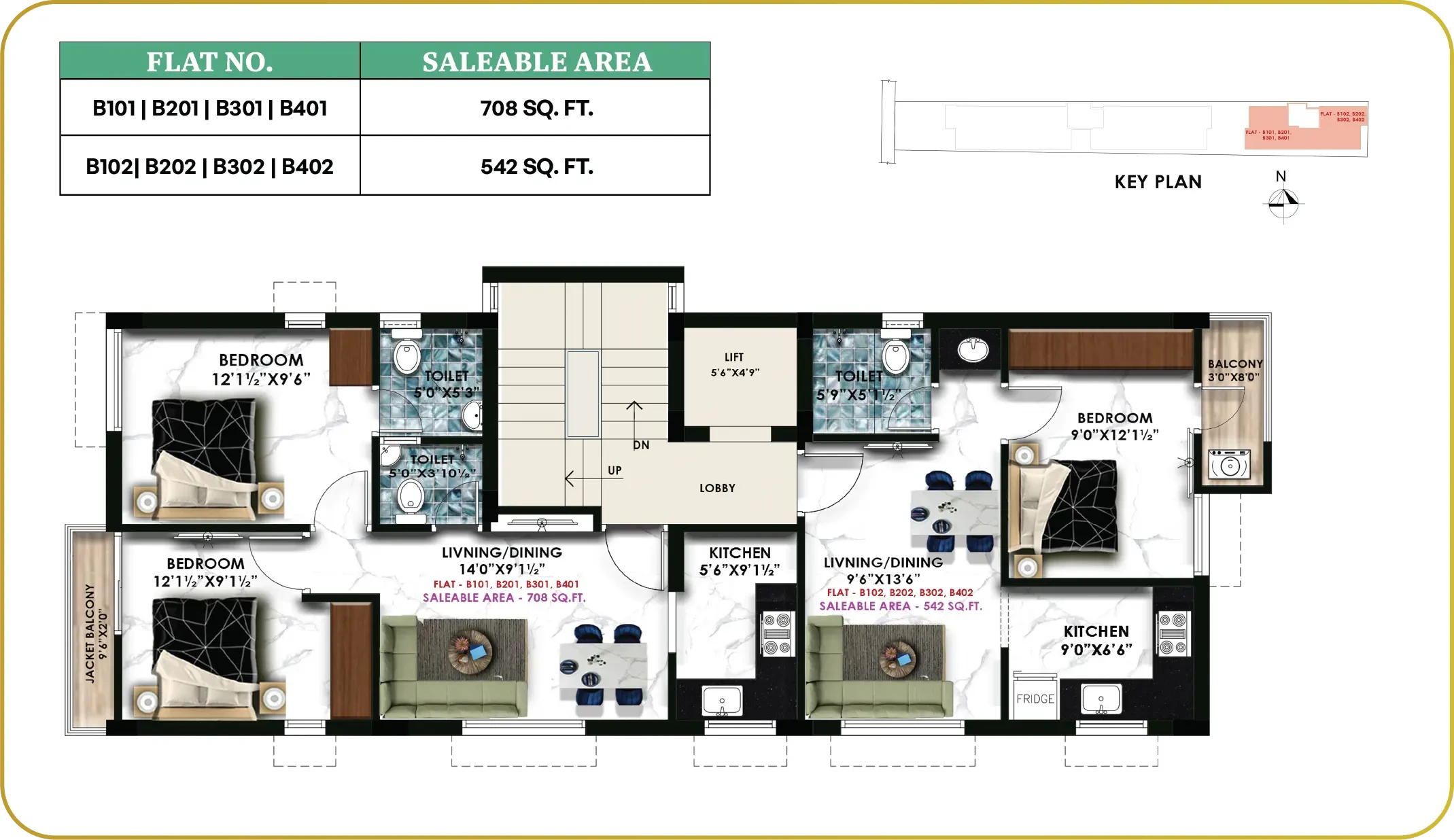 - Power Backup: Generator backup for the lift, pumps, common area lights, and specific points (lights/fans) within apartments.
