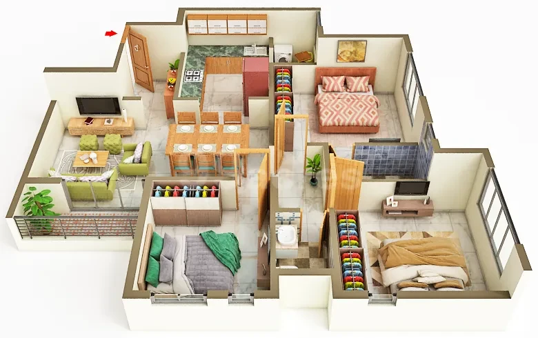 - Bedroom Doors: Wooden frames with 35mm thick, both-side laminated finish shutters.