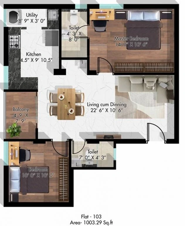 2 BHK Apartments: Sizes range from approximately 1,003 sq. ft. to 1,051 sq. ft..