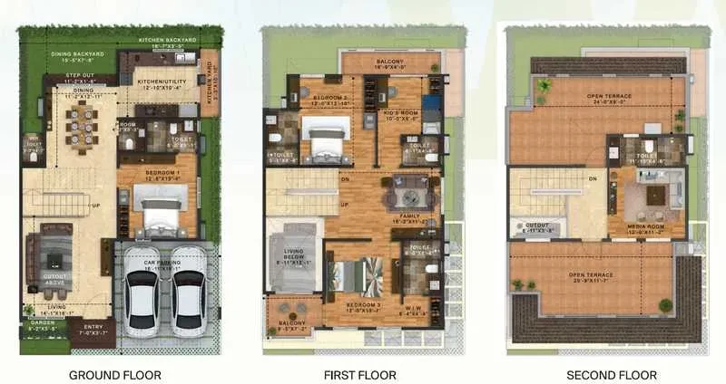 Terrace, sit-out and balcony areas are finished with pressed clay tiles or anti-skid ceramic tiles.