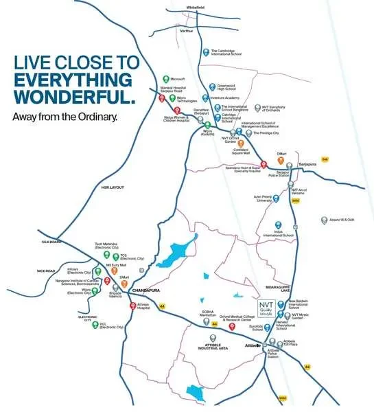 NVT A Wonderful World is a luxury residential development by NVT Quality Lifestyle, located off Sarjapur–Attibele Road in East Bangalore. The project spans 102 acres and is planned as a mixed development. Over time, it will feature multiple residential phases that include luxury villas and apartments.