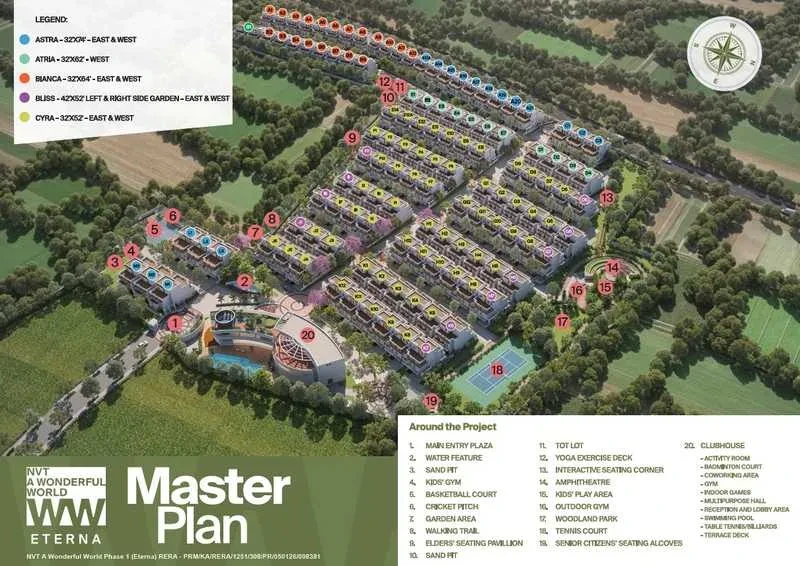 Phase 1 of the project, known as NVT Eterna, set in a good 10.5 acres, has officially launched in February, 2026. It showcases beautifully designed premium 4 BHK luxury villas. This first phase represents the initial villa offering within the larger NVT A Wonderful World township. This community is located next to a picturesque 300-acre Bidraguppe lake, providing residents with a peaceful, nature-infused living experience while still being conveniently close to Bangalore’s major IT hubs, schools, hospitals, and lifestyle spots.