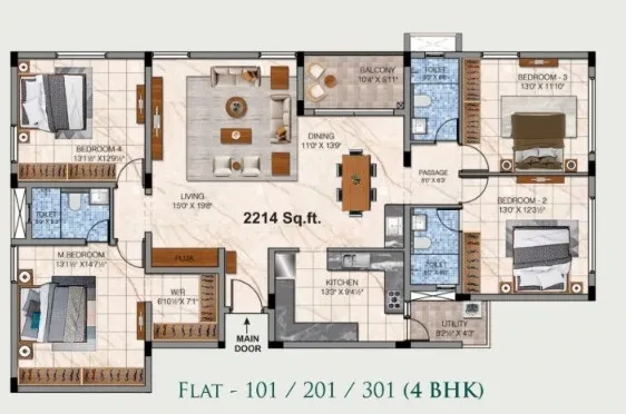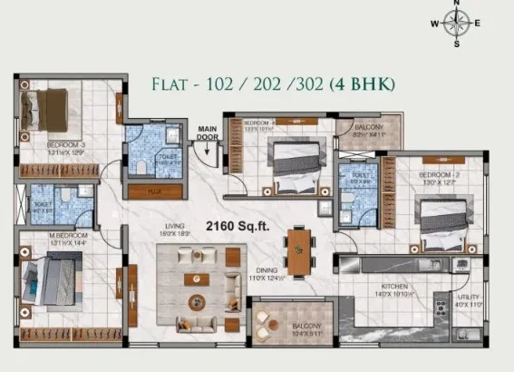 Toilets, Balconies & Utility: Anti-skid branded vitrified tiles (24" x 24")