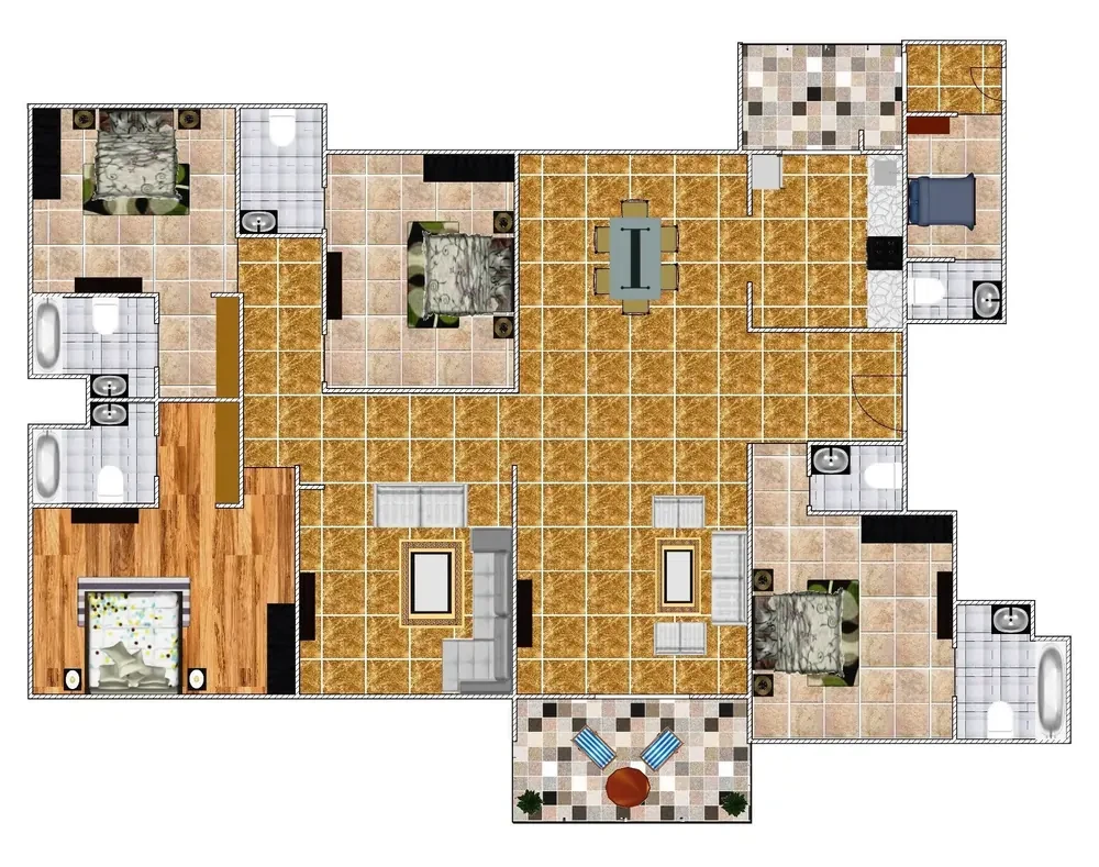 | Toilets / Sanitary | • Floors & walls up to false ceiling: Marble / engineered stone / ceramic / vitrified tiles. • High-quality fittings (CP fittings, etc.), exhaust fans. |